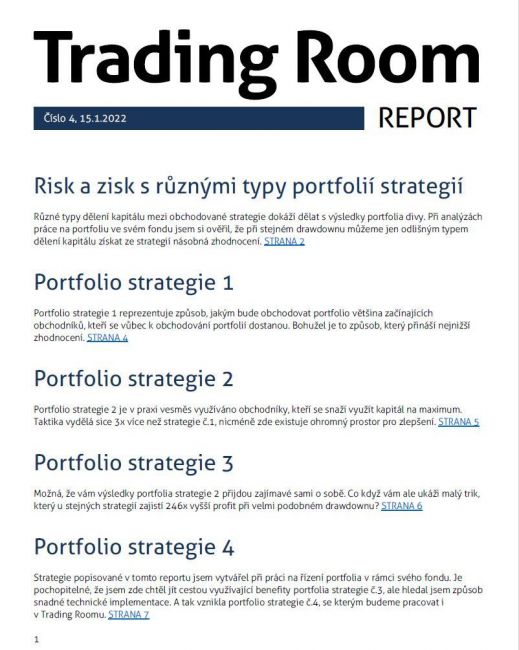 Ve čtvrtém reportu se věnuji portfolio strategiím. Aneb jak díky vhodnému řízení velikosti pozic dosahovat násobného zhodnocení při stejném drawdownu. Vše je popsáno v reportu, který si můžete stáhnout na této stránce: https://www.financnik.cz/forum/tradingroom1/trading-room-1/report (pokud se Trading Roomu účastníte).