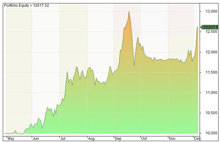 Takto vypadá equity křivka živě obchodovaných obchodů při kapitálu 10 000 dolarů: