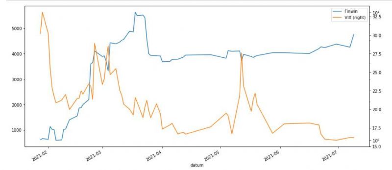 Takto vypadá výkonnost Finwinu při různých úrovních VIXu (index volatility – v grafu zobrazen oranžově):