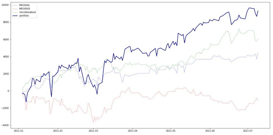 U MR3000 obchoduji také long i short stranu (tedy stejně jako u Finwinu) a zde je pro ilustraci výkonnost portfolia, ve kterém kromě MR3000 obchoduji pro diverzifikaci ještě trend following systém MicroBreakout (na Finančníkovi jsem jej popisoval například zde).