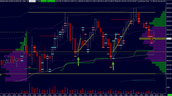 Trh dlouhodobě trenduje vzhůru (tj. základní kontext), otevřel výrazně nad včerejším range (další informace o kontextu) a pomalinku rostl. Cca 15 minut před vstupem jsem si vyznačil oblast 4025.5 s tím, že v dané oblasti mám zájem obchodovat do longu. Vstupoval jsem pak na patternu „FVR“ – pokud by se vstup odehrál výše, tak bych jej nebral, protože existovala větší šance, že trh doklesá k 4025.5.