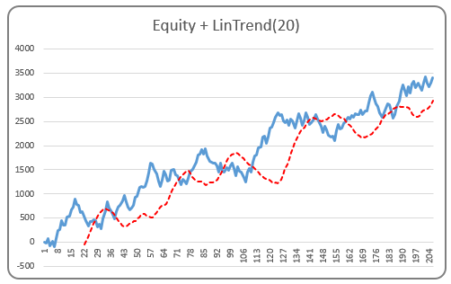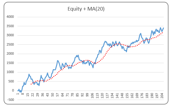 Již zajímavější a v praxi použitelnější přístup zahrnuje aplikaci klouzavého průměru na naši equity křivku. Zkrátka a dobře tak, jak aplikujeme klouzavý průměr na cenový graf, tak v tomto případě aplikujeme klouzavý průměr na naši equity křivku. Jednoduchá aplikace základního klouzavého průměru s periodou 20 na equity křivku může vypadat například následovně: