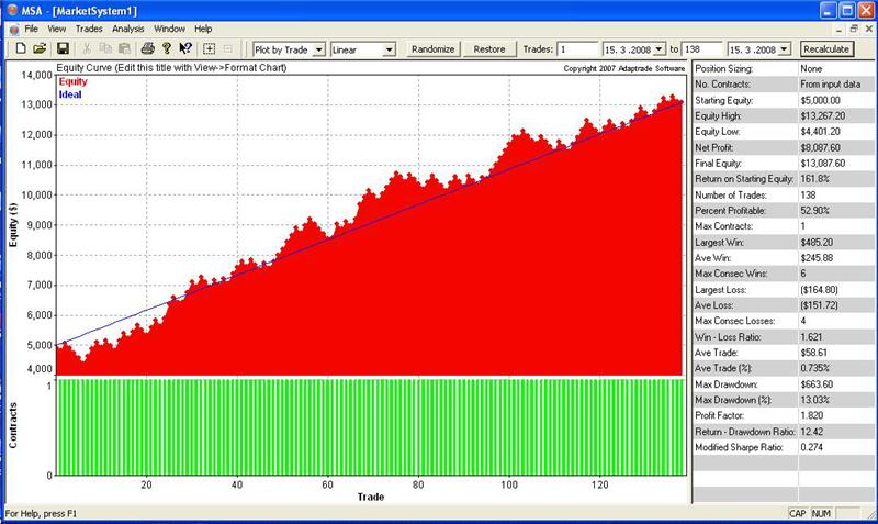 Taktiez si dovolim pridat svoj backtest - avsak na rozdiel od vyssie uvedenymi backtestami bol moj backtest urobeny na zaklade auto-backtesting pomocou Genesis Trade Navigatora. Testoval som zatial iba 3 patterny: 0/100, BigV a 0/V do stran Short a Long ; testovane obdobie: 13/09/2007 - 31/03/2008.