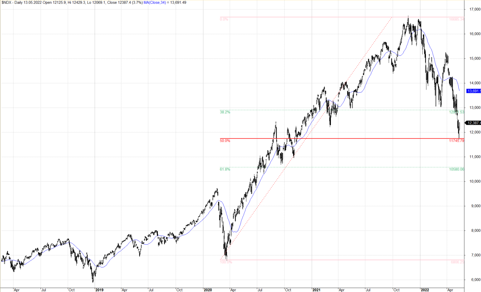 Od 50% retracementu se v pátek odrazil také index Nasdaq 100, který je ale stále podstatně výše, než byly hodnoty indexu před covidem.