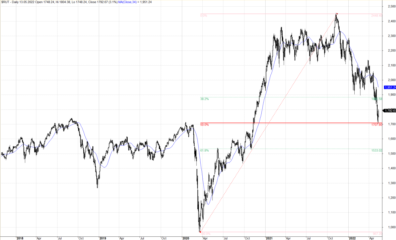 Pohled na graf vydá za tisíc slov. Největší propady se poslední týdny odehrály v menších technologických růstových titulech. Index Rusell 2000 se minulý týden propadl na 50 % hodnoty posledního pohybu. Resp. dosáhl předcovidových hodnot: