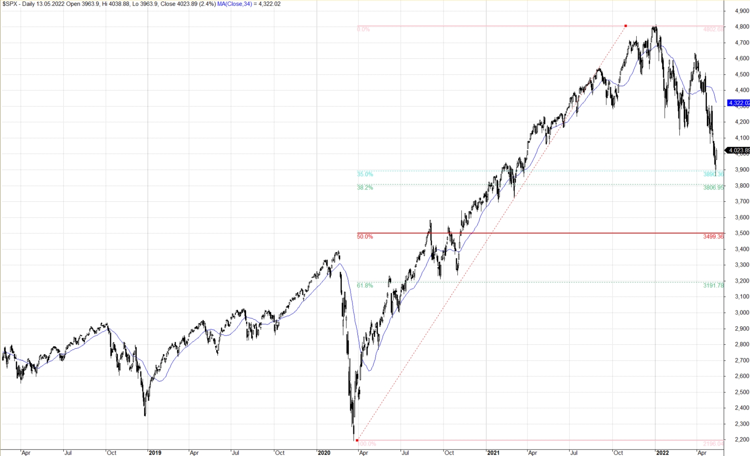 Diverzifikovanější index SP500 se zatím drží výrazně více – propad byl zatím v oblasti cca 35% retracementu pohybu za poslední dva roky: