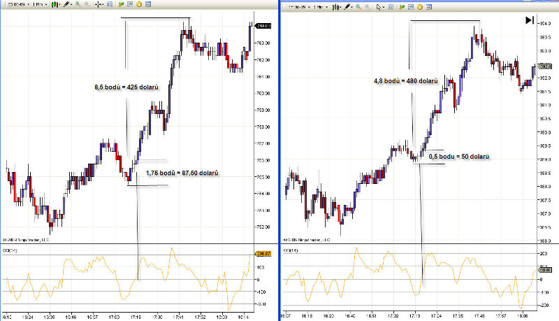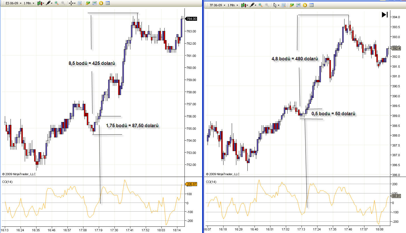 Hrubá ukázka srovnání podobného vstupu na trhu ES vs. TF. Pokud bychom vstupovali na překřížení CCI přes nulovou linku, nabídl by TF vstup dříve s menším stop-lossem a vyšším potenciálem profitu (ukázka je zcela ilustrační a uvažuje pouze o potenciálu, nikoliv realizovatelném profitu). Na druhou stranu je trh TF často „živější“ a může nabídnout více falešných vstupů pokud nebereme v úvahu další filtrování. S podobnou analýzou by měl čas strávit každý obchodník (klikněte pro větší obrázek).