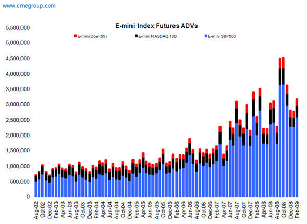 Co se likvidity týče, indexům kraluje bez diskuze trh E-mini S&P 500. Následuje E-mini Nasdaq 100 a poté E-mini Dow. Likvidita E-mini Russell 2000 (není na grafu) je dnes přibližně srovnatelná s likviditou E-mini Dow, občas trochu nižší.