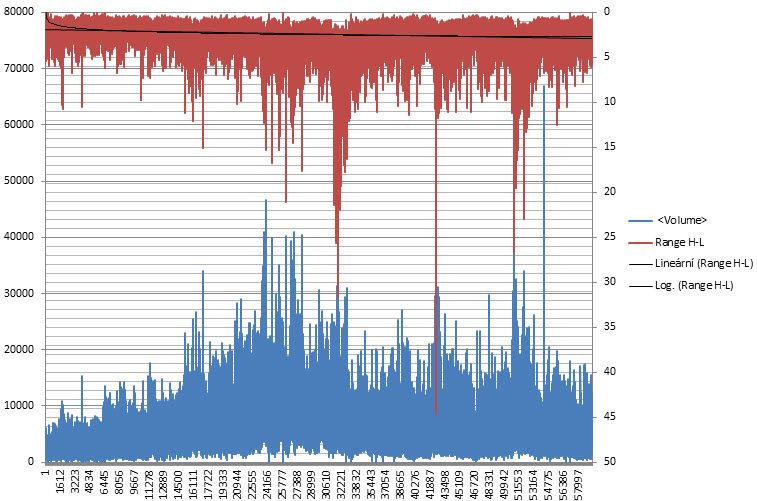 Poté jsem vytvořil jednoduchý graf, kdy jsem proti sobě zrcadlově nechal zobrazit toto rozpětí (volatilitu) každé úsečky (červená část grafu, ke kterému se vztahuje osa Y vpravo) a volume na každé úsečce (modrá část grafu, ke kterému se vztahuje osa Y vlevo).