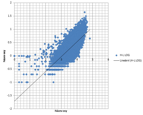 Jako další vizuální kontrolu jsem využil již trochu pokročilejší koncept. Vytvořil jsem LOG hodnoty rozpětí a LOG hodnoty volume a nechal je zobrazit v rámci scatter grafu, do kterého jsem nechal vložit spojnici trendu. V ideálním případě bychom chtěli vidět přímku 45 stupňů, která by ukazovala jasnou závislost mezi volume a volatilitou.