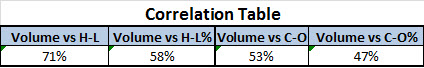Korelace mezi volume a volatilitou vyjádřenou jako rozdíl mezi HIGH a LOW každé úsečky je 71%, což je vysoké číslo a finální potvrzení našeho předpokladu.