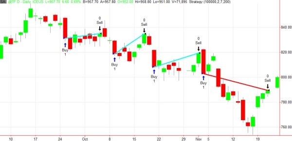Celý tento jednoduchý systém je možné v TradeStation napsat na dva řádky poměrně srozumitelného kódu: