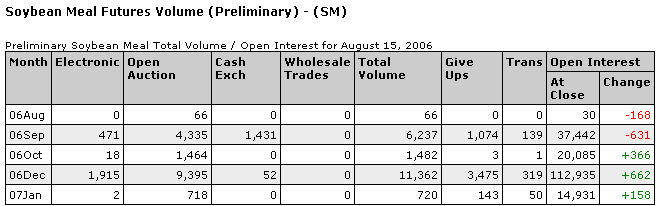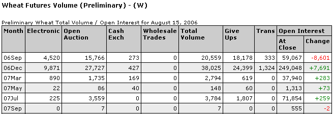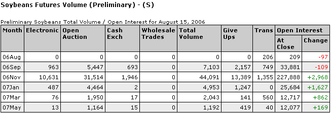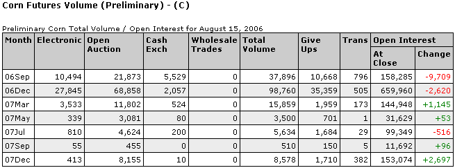 To se naštěstí nyní změnilo. Podívejte se jak byly například obchodovány nejběžnější zrniny v úterý 15.8.2006. Číslo udávané ve sloupci Electronic zobrazuje denní likviditu pro elektronický trh, číslo ve sloupci Open Auction likviditu pro pitový trh. U všech trhů je zatím likvidita pitového trhu vyšší, avšak elektronický trh je v nejbližším kontraktním měsíci vždy již dostatečná - a to je pro podstatné. Čísla myslím hovoří za vše: