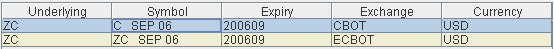 K zadávání příkazů přes IB pouze několik poznámek. Je třeba pamatovat na skutečnost, že zrniny se stále obchodují jak elektronicky tak pitově. IB dnes umí adresovat oba trhy (ale pro pitové obchody si musíte platit extra příplatky za data) a při výběru zkratky trhu je tak třeba vybrat správnou burzu - pro elektronické trhy vybíráme vždy ECBOT. V IB se vám výběr po zadání zkratky komodity (ZC pro kukuřici - viz výše) ukáže automaticky v podobě následující tabulky:
