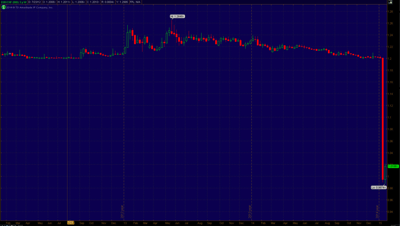 V okamžiku, kdy svoji politiku SNB zrušila, švýcarský frank skokově posílil o pohyb, který nemá ve finančním světě příliš obdoby. Zde je týdenní graf EUR/CHF: