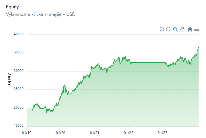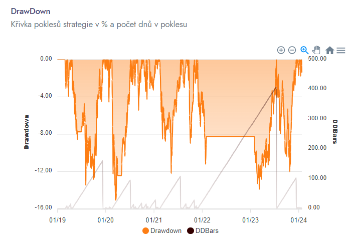Takto vypadá equity křivka a drawdown u strategie popisovaného typu, kterou mám ve svém systematickém portfoliu pod názvem SMO NDX (jde o screenshot z platformy Trading Room, kde u strategie sdílím své signály):