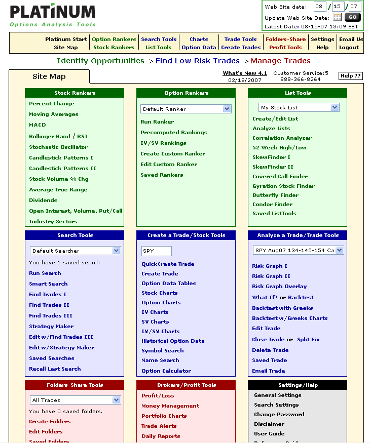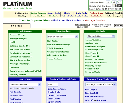Pokud se na problematiku podíváme z pohledu vynaložených investic, pak jeden z nejdostupnější nástrojů je Optinetics Platinum. Je to čistě webová služba (tj. pracuje se výhradně v prostředí internetového prohlížeče), obsahující řadu analytických opčních nástrojů, skenerů a z pohledu našeho článku také důležitý backtestovací modul. Platinum obsahuje historická denní data opcí (EOD) a uživatel si může nastavit libovolné aktuální nebo historické datum, ke kterému se data v systému nastaví k příslušnému obchodování.