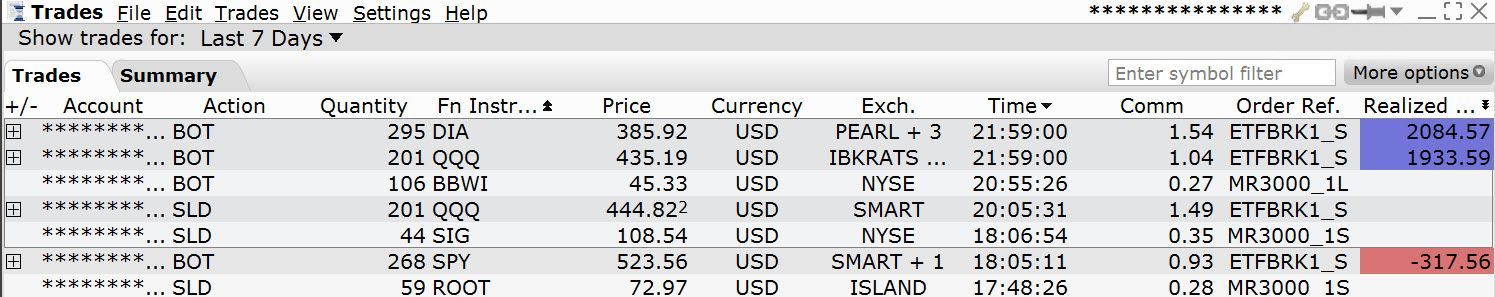 A takto dopadl hned první obchodní den systému (obchody jsem prováděl na ETF typu SPY, QQQ a DIA proto, že je to jednodušší pro můj současný autotrader a coby profesionální obchodník mám k těmto trhům přístup).