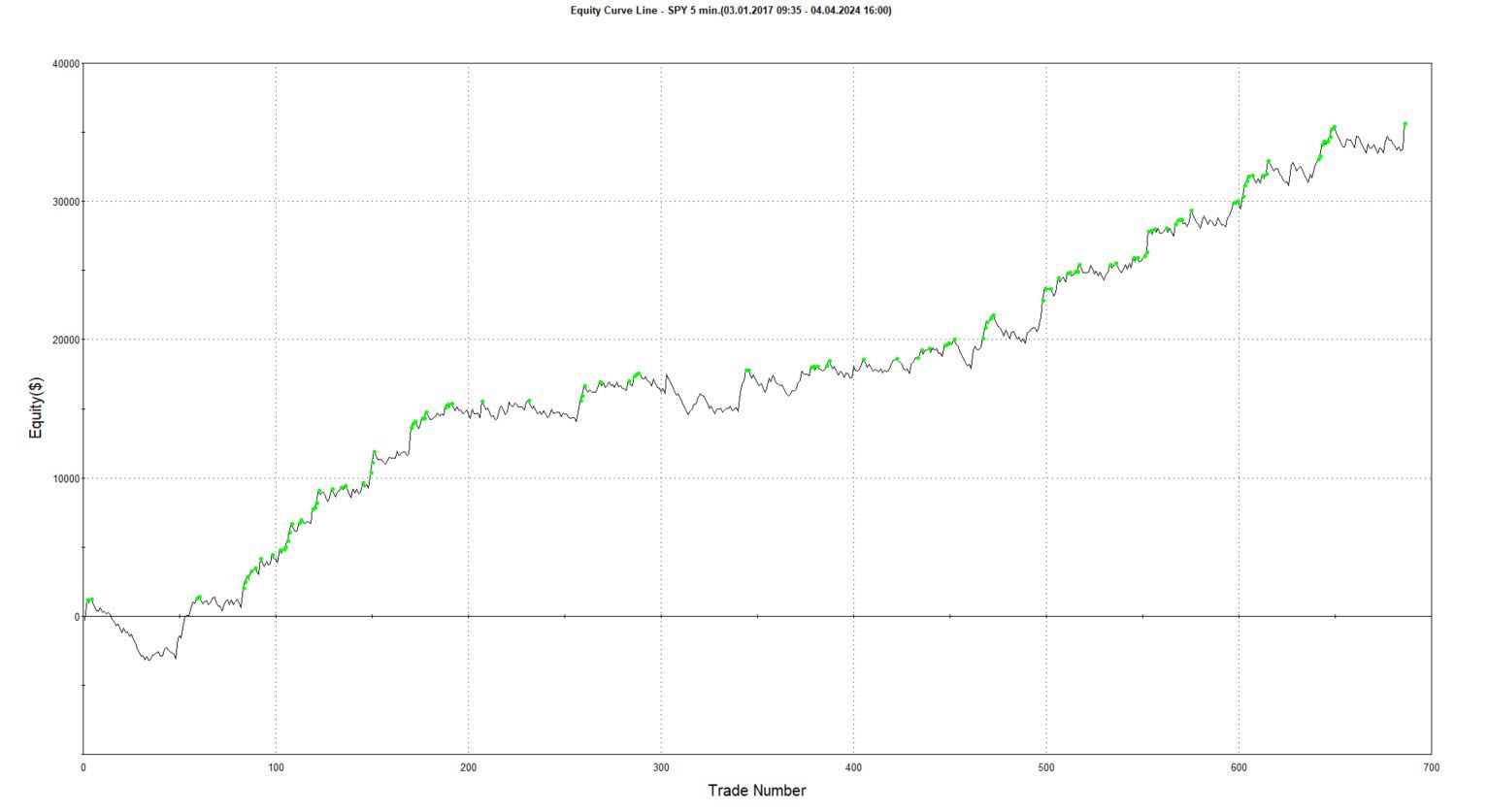 Jde o aplikaci breakout logiky na trh S&P 500 skrz ETF SPY. V praxi sice tento ticker většina obchodníků využívat nebude, protože jej v EU není možné obchodovat na retailových účtech, ale v Trading Room máme k dispozici portfolio tester pracující s akciemi, a proto testujeme strategie na ETF. Následné obchodování systému s využitím e-mini futures vypadá velmi podobně, plus navíc plánujeme breakouty obchodovat skrz opce – viz dále). Zobrazená výkonnostní křivka zahrnuje běžné komise a obchody jsou prováděny long i short. Navíc princip funguje na všechny další běžné indexy a trhy jako ropa a zlato.