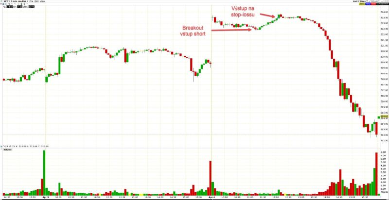 Ztrátový obchod vypadal totiž přesně tak, jako to potěší nejméně – S&P 500 doklesal k úrovni pro breakout short a systém vstoupil do krátké pozice. Těsně poté se trh obrátil a dostoupal k hranici stop-lossu. Ten zasáhl, chvíli šel do strany a pak přišel sešup, ve kterém by pozice vydělala pěkný peníz: