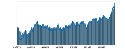 Červená linka zobrazuje živé obchodování od konce swingového workshopu (tedy cca 2,5 měsíce), kde všichni účastníci dostali kód systému v otevřené podobě. Výsledky vůbec nejsou špatné. Anualizované zhodnocení 23,5 %, sharpe ratio 1,0 a drawdown -4,5 %. Nicméně v absolutním porovnání strategie za poslední rok zdaleka nepřekonala benchmark – index S&P 500 (byť k tomuto se ještě dostanu níže), zobrazený šedivou křivkou.