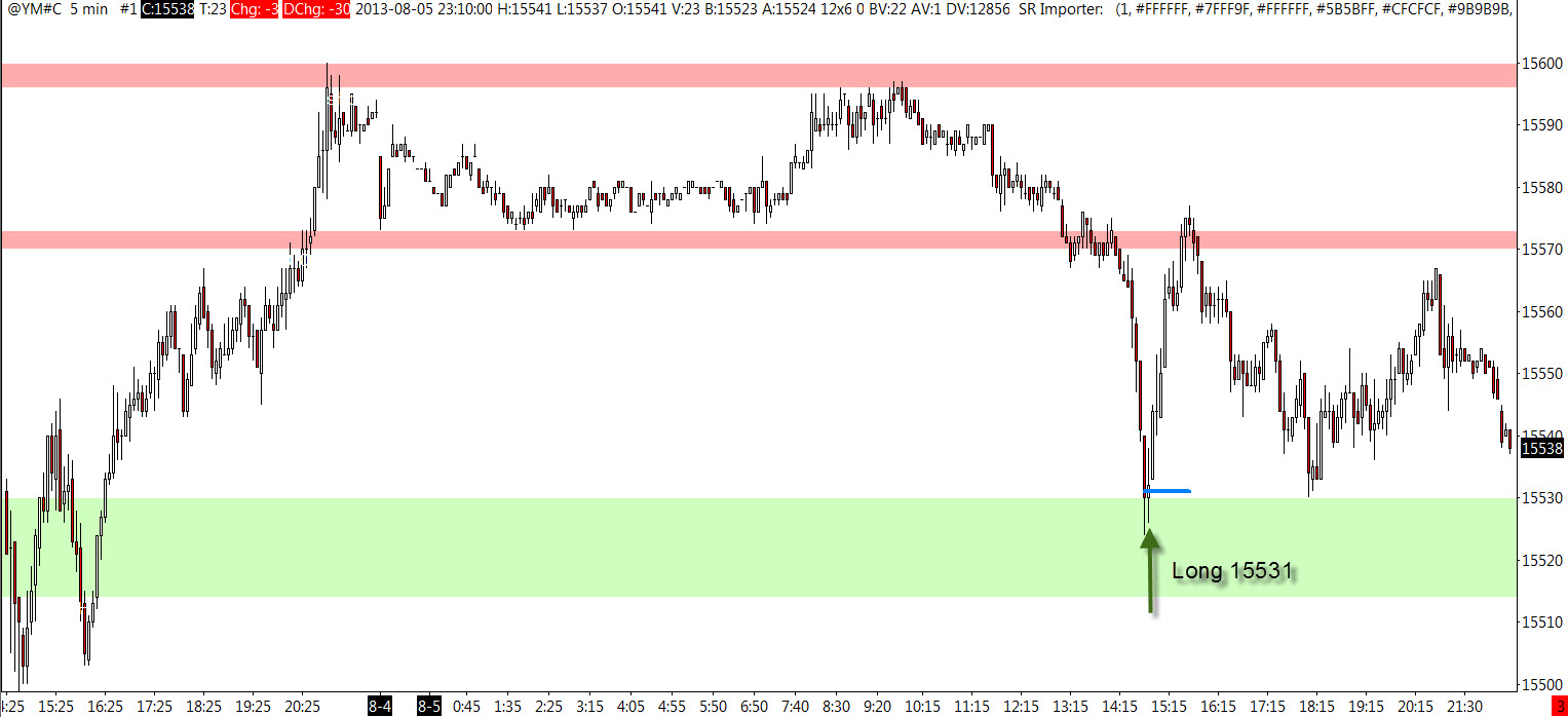 Všechny trhy začaly v pondělní seanci klesat, ovšem například jen YM doklesal do oblasti, kterou jsem v rámci přípravy považoval za nejzajímavější pro vstup – TF (e-mini Russell) se otočil výrazně výše. Navíc YM vytvořil krásnou podobu patternu, který obchoduji, kdežto například TF vytvořil reverzní úsečky, v rámci kterých bych nevstupoval. Pokud bych obchodoval pouze e-mini Russell, byl bych v této situaci bez obchodu. Na YM jsem vstoupil long na ceně 15531.