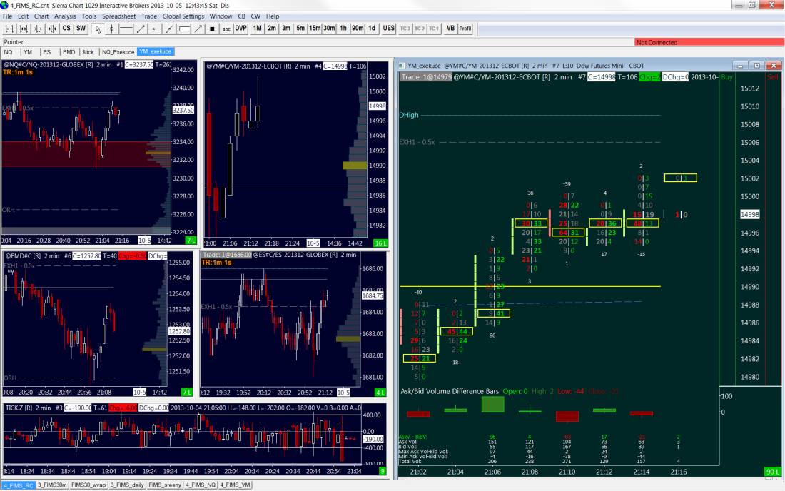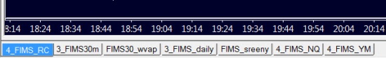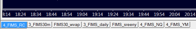 A nyní využití výběru grafu. Jak víte, v rámci FIMS obchoduji s použitím Numbers barů, které potřebuji zobrazovat na větší části monitoru. Obchody přitom zadávám do několika trhů najednou. Jelikož vesměs nedržím současně otevřenou pozici v několika různých trzích, stačí zobrazení Numbers barů jen pro jeden trh. Ovšem jak jednoduše grafy přepínat skutečně na „jeden rychlý klik“? Stačí grafy v programu položit přes sebe a nahoře v záložce grafu zvolit konkrétní podle potřeby.