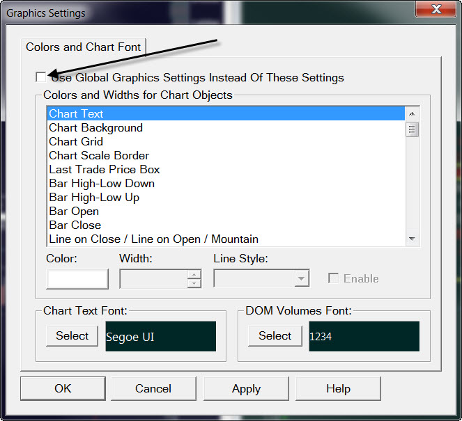 Pokud si budete chtít nastavit jinou barvu pozadí (nebo velikost písma atd.) pro jednotlivé grafy, je třeba použít volbu Chart > Graphics Settings a odškrtnout volbu Use Global Graphics Settings Instead of These Settings: