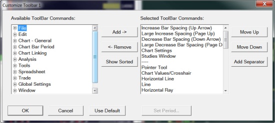 Plus je potřeba naplno využít možnosti ve vlastním přizpůsobení horního menu programu. Zde si můžete nadefinovat tlačítka pro často používané nástroje, pro vaše timeframy, pro přepínání noční a denní seance.