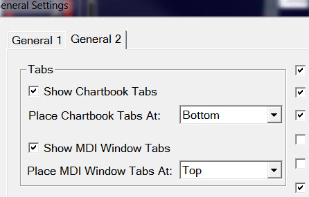 Záložky tzv. Chartbooků si můžete zobrazovat v zápatí nebo hlavičce programu. Nastavujte se to pomocí Global Settings > General Settings > General 2 a sekce Tabs: