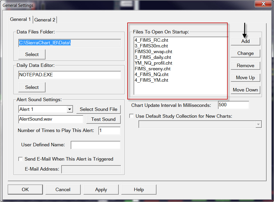 Pokud si nadefinujete strukturu „záložek“, patrně budete chtít, aby se otevíraly automaticky vždy při spuštění programu. To se opět nastavuje pomocí Global Settings > General Settings a přidáním chartbooků do Files To Open on Startup: