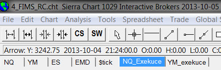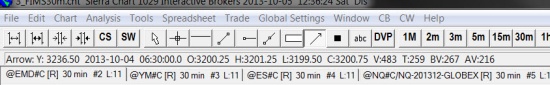 V první záložce mám grafy, které sleduji v rámci exekucí, v dalších záložkách mám grafy na vyšším timeframu a podobně. Pokud se připravuji na obchod, sleduji většinou nejprve vyšší timeframe a teprve v oblasti vstupu se přepínám na nižší timeframe – jednoduše kliknu na příslušnou záložku v zápatí Sierra Chart.