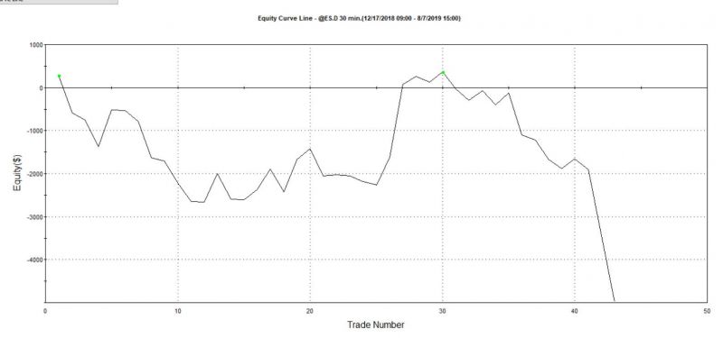 První popis nasazení systému naleznete v článku Očekávání vs. realita obchodování. Jak se připravit? V něm jsem popisoval, že přestože při obchodování vždy podvědomě doufáme v to nejlepší, musíme se připravit na realitu. Která může vypadat třeba tak jako u mého systému. Přestože má systém super historické výsledky a obchodovaný edge dává smysl, po nasazení live se mu příliš nedařilo. Od spuštění prakticky ztrácel. A nejen v rámci první série cca 13 obchodů popisovaných v článku. Systému se nedařilo ještě několik měsíců. Equity křivka se započítanými komisemi a skluzem (tick na vstupu i výstupu) vypadala do poloviny roku 2019 takto: