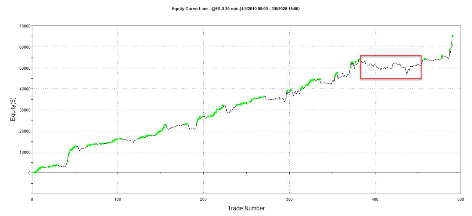 Volatilita strategie musí odpovídat velikosti účtu. Například popisovanou strategii v ES sám neobchoduji s alokací 10 000 USD, ale výrazně vyšší. Zde je extrémně důležité rozumět metrikám typu sharpe ratio. Viz Vyhodnocování obchodních systémů z pohledu dostupných metrik. Skutečně výnosy generujeme podstupovaným riskem a ten je třeba řídit. Jistě, pak nebudeme dosahovat zhodnocení 100 % za pár měsíců, ale budeme schopni strategie obchodovat dlouhodobě.
