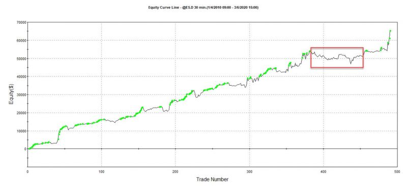 Ten pohled vůbec není hezký. Zejména, pokud takový systém obchodujete jako nováček (třeba jste si jej koupili nebo pronajali), bez porozumění dlouhodobých pravděpodobností a podkapitalizovaně. Například s typickým účtem 10 000 USD, který se pro e-mini ES běžně doporučuje. V tom případě nyní čelíte drawdownu cca 45 % a ohromné nejistotě, jestli metoda funguje. Pokud jste tak již neučinili, pravděpodobně systém přestanete obchodovat.