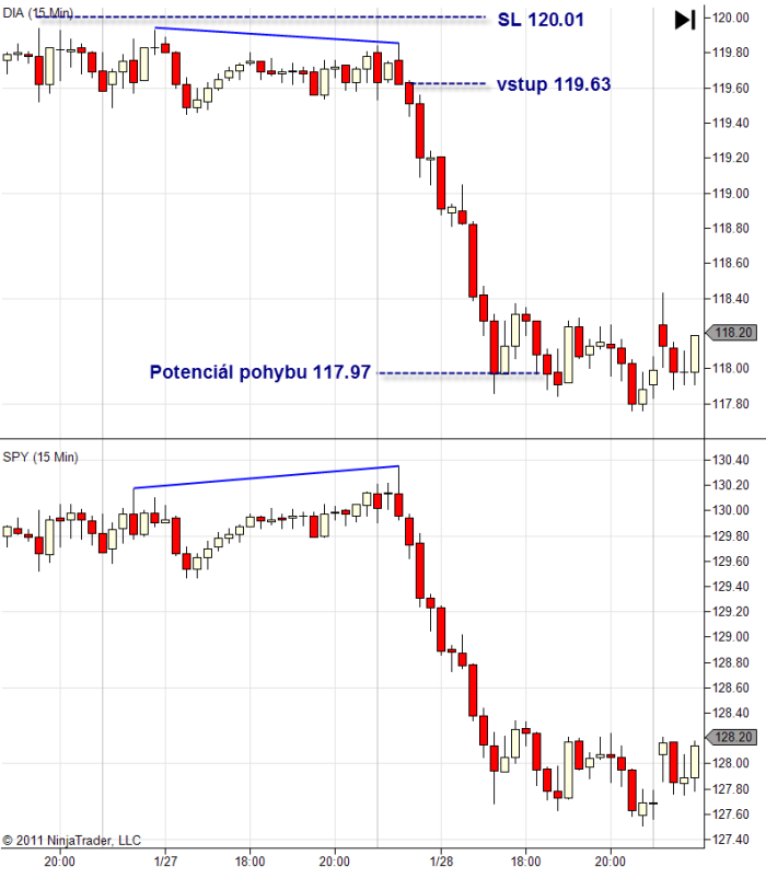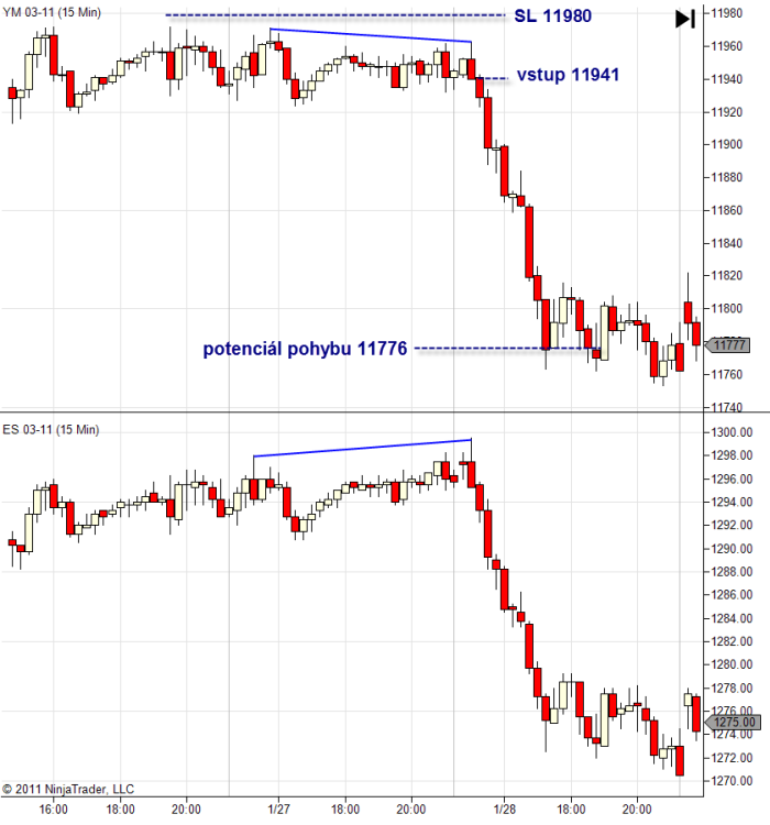 Teoretický obchod na základě IM divergence mezi indexy a na vyšším, 15ti minutovém timeframe (pouze ukázka). Risk v tomto případě vychází na cca 39 ticků, což i v levném trhu YM znamená 195 USD. Potenciální max. profit (hodnoceno zpětně jen pro představu dolarového vyjádření pohybu) činil 165 ticků, tj. 825 USD.