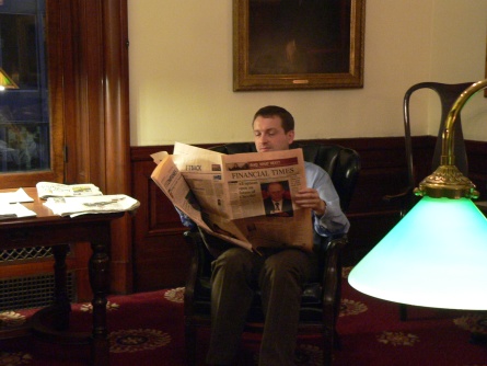 V klubu vídáte prakticky od rána až do večera většinou muže (ženy měly do tohoto klubu ještě nedávno zcela zákaz vstupu) a to v oblecích a většinou s telefonem u ucha. Jedním z nejčastějších telefonátů, který kolem sebe slyšíte, je zadávání pokynů brokerům na burzu. Toto jsme zažili hned při příjezdu – v lobby seděl elegantní muž a do telefonu dával kompletní instrukce svému brokerovi na příští den. A pokud zrovna obchodníci zde netelefonují, tu a tam je můžete vidět s PDA v ruce. Naposledy jsem jel s takovým ve výtahu – celou cestu pozoroval na svém PDA živá data a grafy.