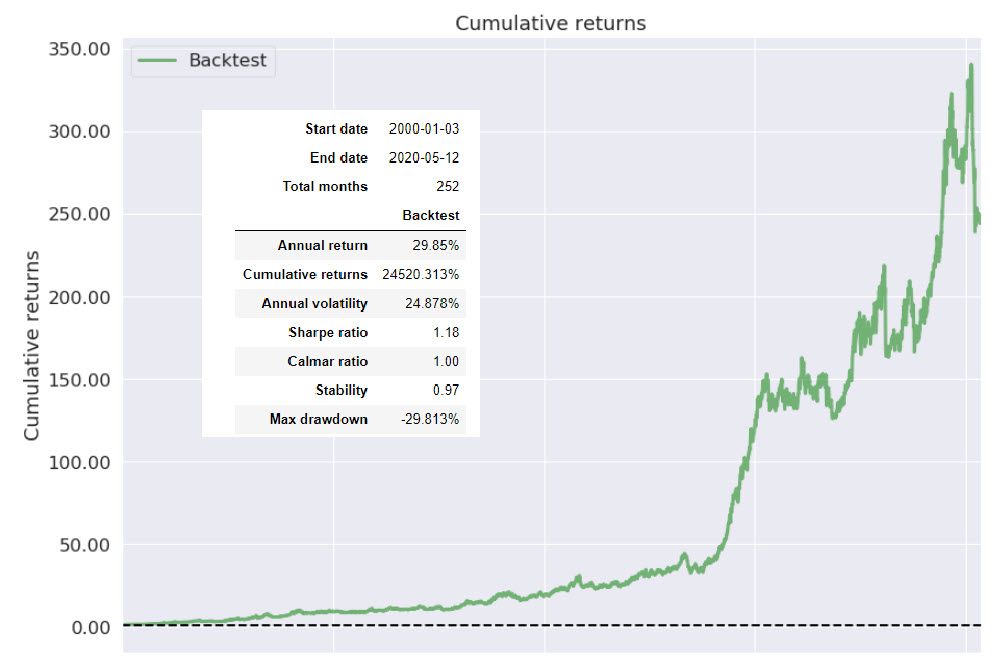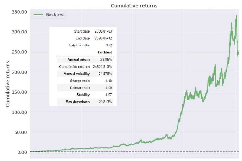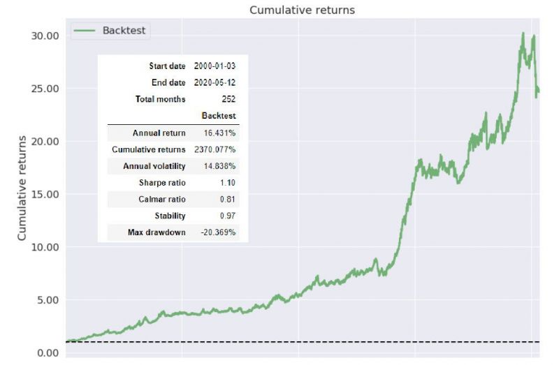 Systém má Sharpe ratio cca 1,1. Pomocí modulu risk managementu otevíráme pozice tak, aby byla průměrná roční volatilita cca 15 %. Při backtestu s použitím dat 1. 1. 2000 – 12. 5. 2020 vychází průměrné roční zhodnocení 16,4 % (což hrubě odpovídá výše uvedenému vzorečku, kdy bychom ke zhodnocení došli vynásobením 1,1 * 15 %). Maximální drawdown byl při této volatilitě -20,3 % a equity křivka vypadala následovně: