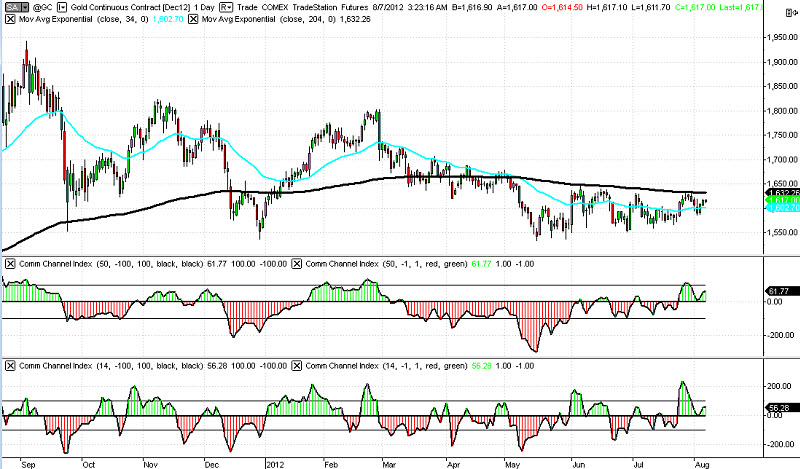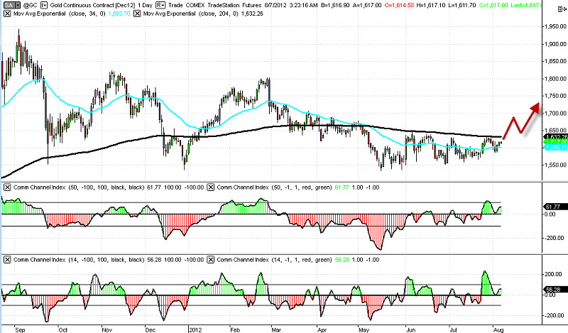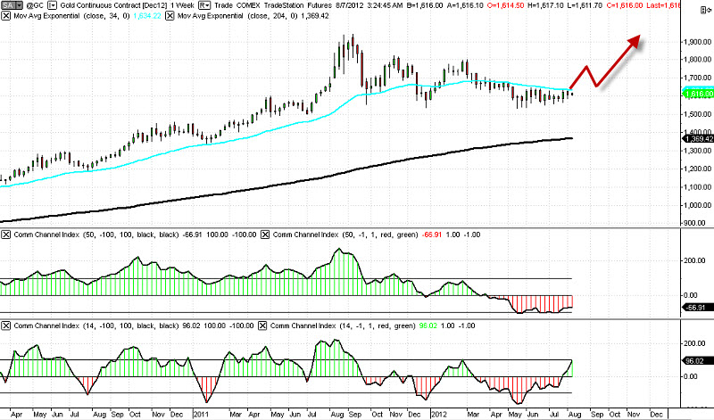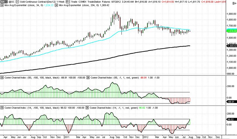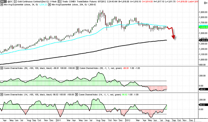 Při pohledu na týdenní graf zlata (článek píši s větším předstihem dne 7. 8., neboť mě nyní čeká cesta do ČR a semináře v Praze) vidím mnoho zajímavých věcí. Tím prvním je skutečnost, že zlato již minimálně 13 týdnů hledá svůj směr, takže na týdenním grafu vykazuje poměrně solidní chop v podobě stále se více svírajícího trojúhelníku. Tato formace mně tedy říká, že nemám v trhu aktuálně co pohledávat, dokud se trh nerozhodne pro svůj další směr. Aktuální fáze je nejvíce riziková pro vstup do pozice.