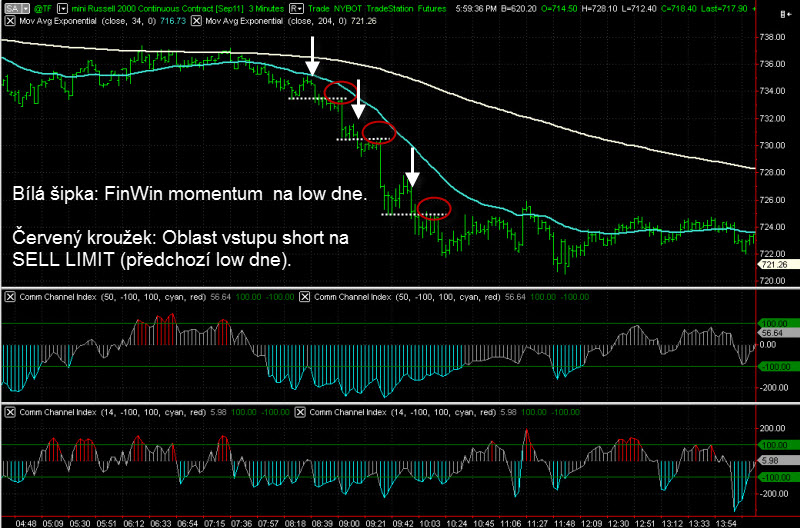 Na obrázku níže jsem zakreslil tři konkrétní situace, kdy trh nabídnul potenciální momentum na stranu short, avšak zcela na low dne (LOD). Následovala však korekce na úroveň předešlého LOD, kde můžeme zvážit agresivní vstup s podstatně menším stop-lossem. Bílá šipka naznačuje momentum na stranu short v podobě FinWin signálu 0/v nebo 2v, červený kroužek pak oblast s cenovou úrovní shodnou s předešlým LOD, na které bychom chtěli vstupovat s LIMIT příkazem (nebo "ručně" s MARKET příkazem).