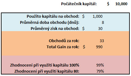 pokud vím, že průměrný obchod trvá 8 dnů, pak mohu při takové frekvenci udělat v průměru kolem 33 obchodů za rok. Při průměrném zisku 30 USD za obchod je to 990 USD za rok - avšak stále hovoříme o alokaci 1,000 USD na obchod. Rozhodneme-li se využít 100% kapitálu, je to zhodnocení 99% za rok, při konzervativnějším exponování 80% celkového kapitálu je to zhodnocení 79% za rok, což je o poznání více, než pasivní investice, s výsledkem 30% za rok. Vše, co k tomu přitom potřebujeme navíc, je obchodní systém, který umožní podobné parametry nabídnout (práce na sestavení takového systému vyžaduje několik měsíců experimentování, hledání, testování) a následně cca 5 minut práce denně na kontrolu pozic, na zadání nových příkazů a stop-lossů.