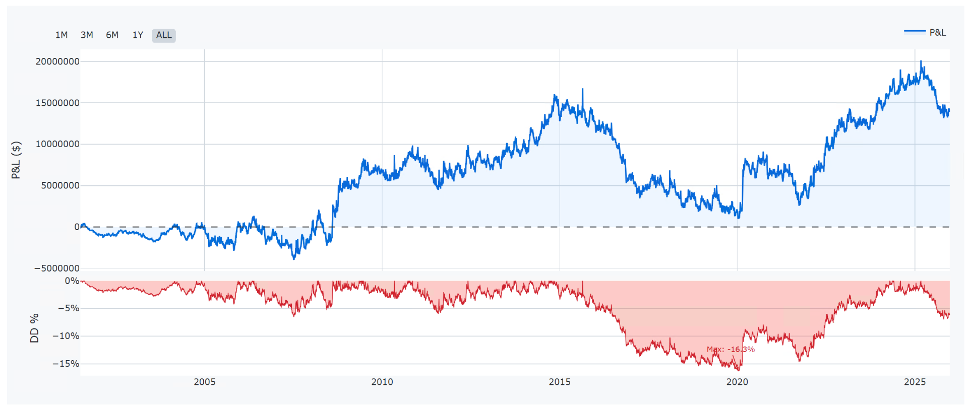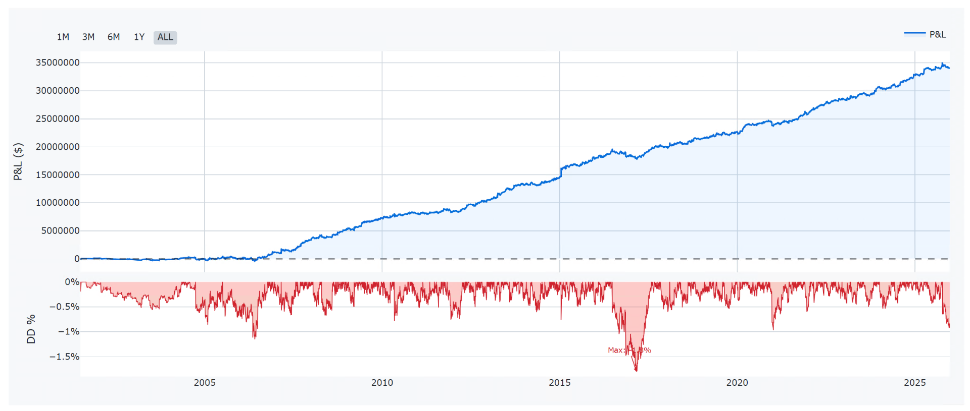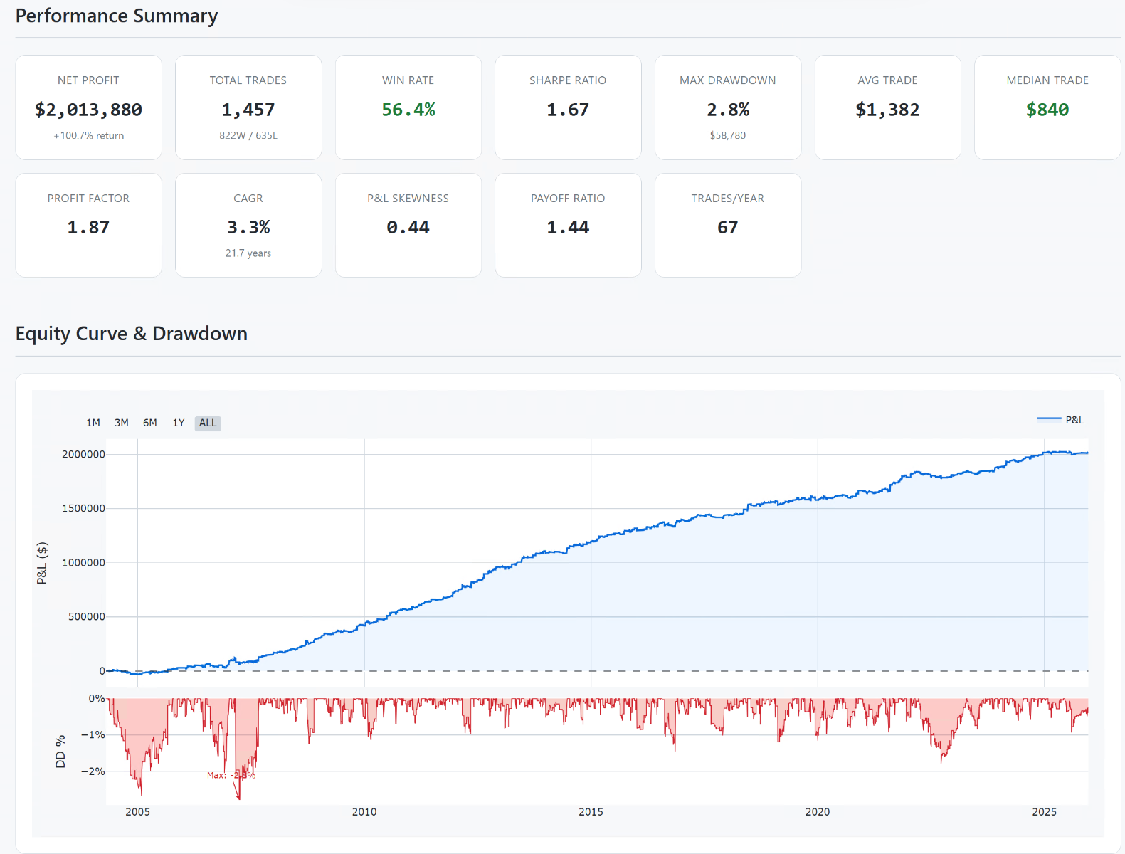 - Sharpe Ratio 1.59: To je na "hrubý" systém bez filtrů a SL velmi solidní číslo. Byť nezapomínejme, že nejsou zahrnuty komise a skluzy.