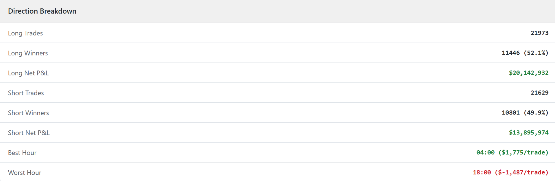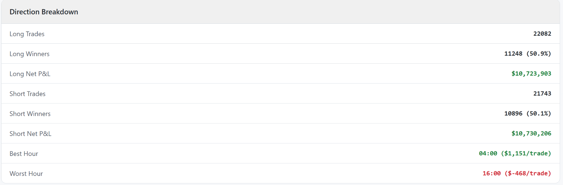 - Charakteristika: S delším časem začíná Long strana dominovat (díky přirozenému růstu řady trhů), zatímco úspěšnost Shortů mírně klesá, ale stále je zisková.