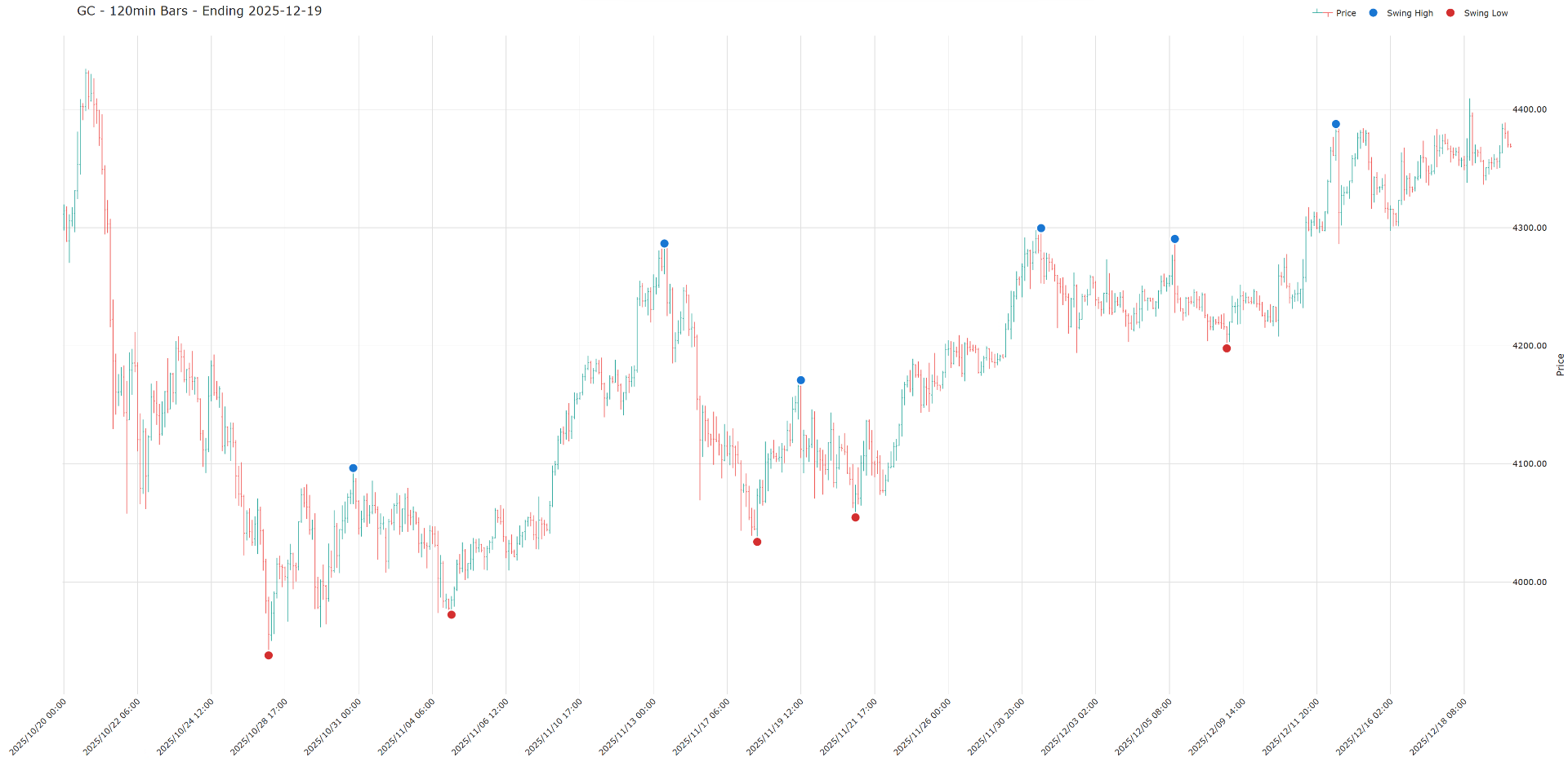 Na grafu níže vidíte 120minutový timeframe futures kontraktu zlata (GC) s vyznačenými swingy. Modré body označují swing high (lokální vrcholy), červené body swing low (lokální dna).