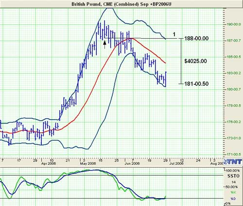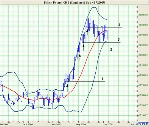 Na obrázku 1 vidíme situaci, kdy se trh Britské Libry (BPU6) nacházel v býčím up-trendu. Během své cesty vzhůru trh několikrát prorazil horní kanál BB a tím nám dal signál k možnému otočení trendu. Jak ale vidíte, trvalo velmi dlouho, než skutečně k otočení došlo. Pokud bychom tedy spekulovali principem, kdy po každém proražení horní čáry, nebo alespoň jejím doteku umístíme vstupní SELL příkaz pod danou, nebo následující úsečku, dostali bychom minimálně 4 prodejní signály, z čehož by 3 vedly do ztráty.