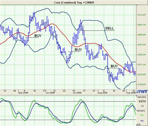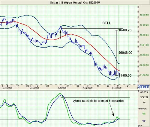 Obrázek 5 a 6: použití BB a Slow Stochastics v cukru (SB) a kukuřici (C)