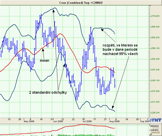 Tak tedy, pokud známe určitou charakteristiku distribuce náhodně generovaných dat, a grafy trhů nejsou nic více a nic méně než náhodně generovaná data (nedělejte si iluzi o tom, že grafy jsou racionálním zobrazením aktuální poptávky a nabídky dané komodity - grafy jsou ve skutečnosti emocionálním zobrazením chování tržního davu a takové se dá defacto nazvat jako náhodně generovaná data), pak víme-li, že 95% všech dat v časovém okamžiku bude vždy náležet mezi 2 standardní odchylky, co se asi stane, jestliže graf určitého trhu vygeneruje hodnotu mimo tyto 2 standardní odchylky? Dříve či později nastane s relativně vysokou pravdepodobností něco, čemu se říká návrat k průměru (revert to mean), což je další statistický fenomén. Jinými slovy víme, že dříve či později zaručeně dojde k otočení trhu, aby se trh mohl vrátit zpět k průměrné ceně. Pojďme si vše zkusit demonstrovat přímo na grafu.