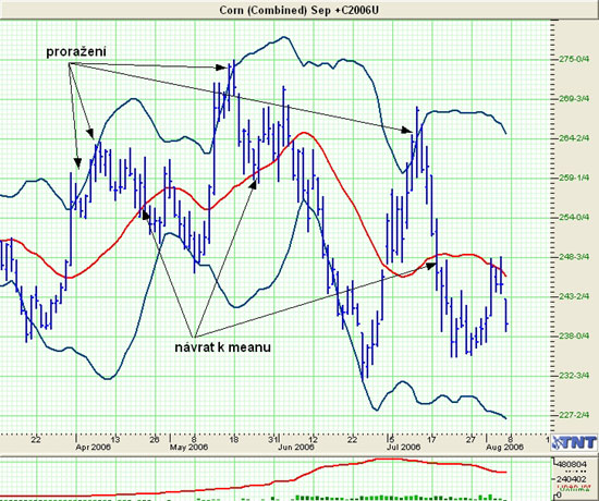 Na obrázku jsem z důvodů snazší orientace načrtnul pouze proražení horní Bollingerovy čáry a následný návrat ceny k meanu. Pokud si však zkusíte prohlédnout spodní Bollingerovu čáru, uvidíte stejný fenomén - cena se po proražení spodní Bollingerovy čáry následně vždy vrací dříve či později ke svému průměru (meanu)!