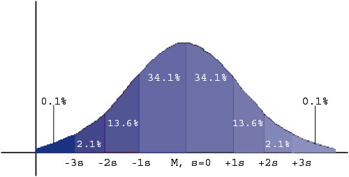 Před mnoha lety bylo jistým vědcem dokázáno, že pokud máme náhodně generovaná data, pak všechna tato data bude možné poskládat do grafické podoby tak zvané „bell curve“, nebo-li křivky v podobě zvonu. Jinými slovy, pokud bychom všechna data interpretovali v grafické podobě a například nanášeli na k tomu uzpůsobený kostičkovaný papír, distribuce všech těchto dat by se pak dala jednou zvýrazněnou čárou popsat jako podoba "zvonu" - viz níže. Tuto křivku (bell curve) pak můžeme následně rozdělit na několik částí: střed, nebo-li mean, který reprezentuje průměr ze všech dat v dané časové periodě a dále na dalších několik částí, kterým se říká standardní odchylky od průměru, neboli standard deviation from mean. Přičemž dále platí, že 68% všech dat v daném časovém úseku se bude nacházet v rozmezí -1s až +1s (viz obrázek) - tomuto rozmezí se říká 1 standardní odchylka, 95% všech dat ve stejném časovém úseku v rozmezí -2s až +2s - tomuto se říká 2 standardní odchylky a 99,7% všech dat ve stejném časovém úseku v rozmezí -3s až +3s, neboli v rozmezí 3 standardních odchylek.