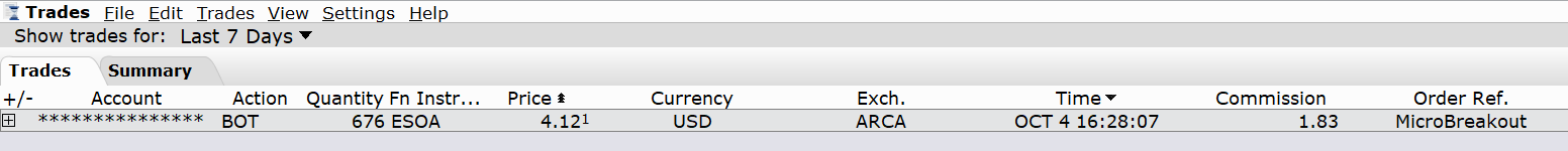 Zde jsem také otevíral pozici 4.10.2023. Konkrétně jsem nakupoval 676 shares akcie ESOA. Na svém živém účtu u Interactive Brokers vidím komisi 1,83 USD. Pokud bych pracoval v režimu „Fixed“, Interactive Brokers by mi účtovalo 676 * 0,005 = 3,38 USD. Tedy opět jsem platil výrazně méně.